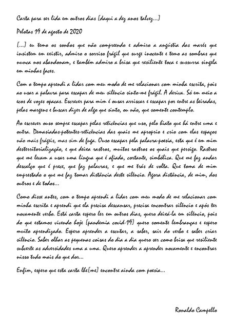 As cartas são a via e um ótimo pretexto para mover o presente em direção do amanhã. As cartas também são o tempo, datam e testemunham os dias, o cotidiano, os acontecimentos. Cartas são formas de memórias desejantes, aquelas que querem durar, querem ser vividas na leitura dos outros, nos relatos, nos legados.